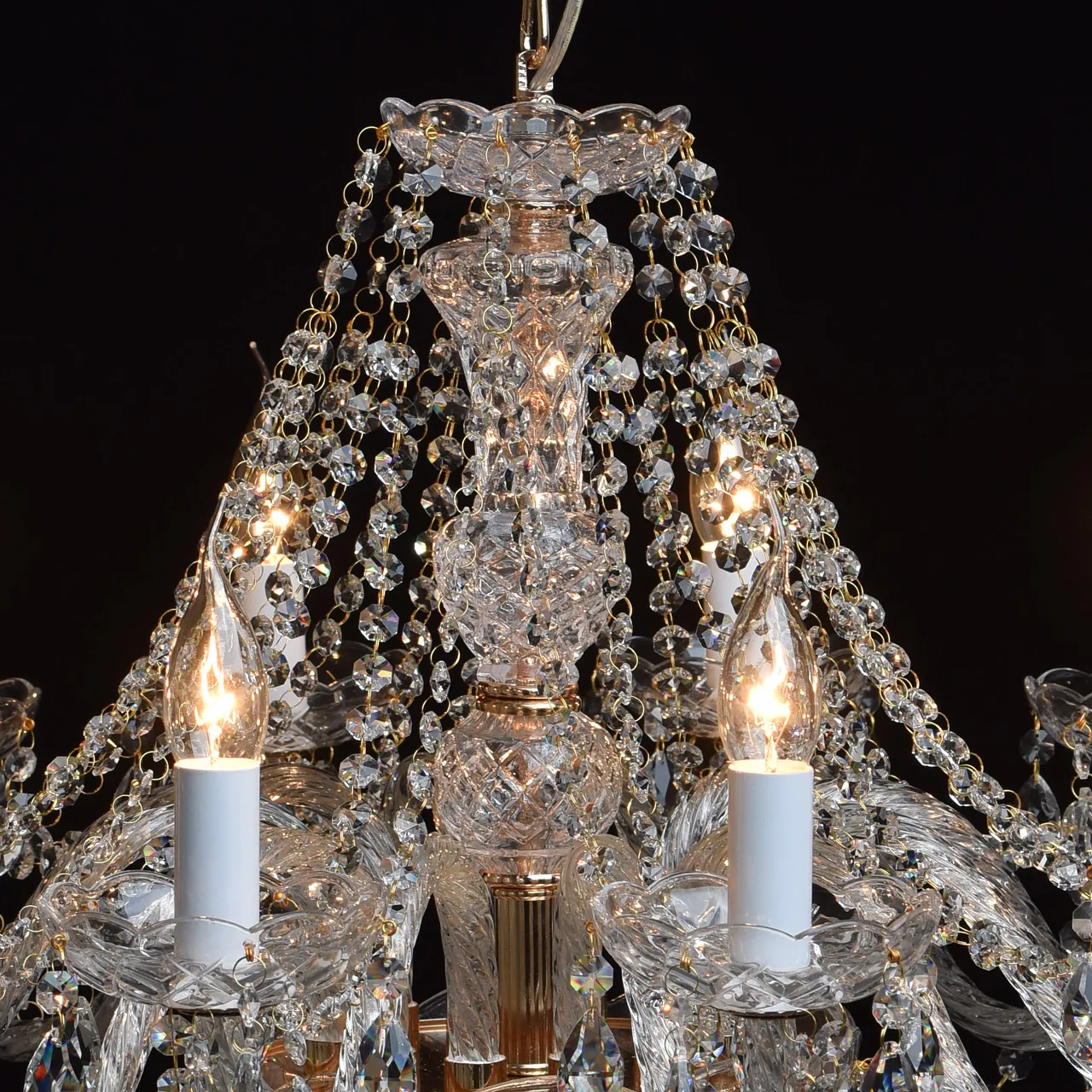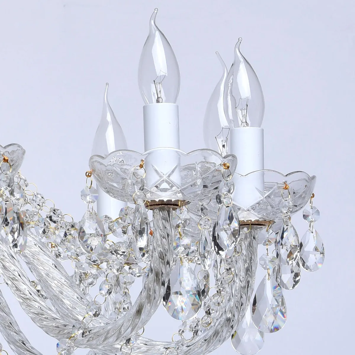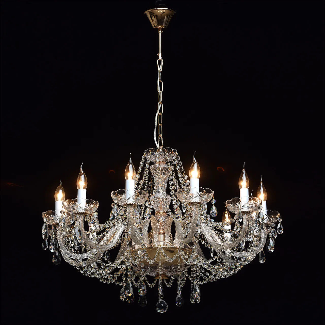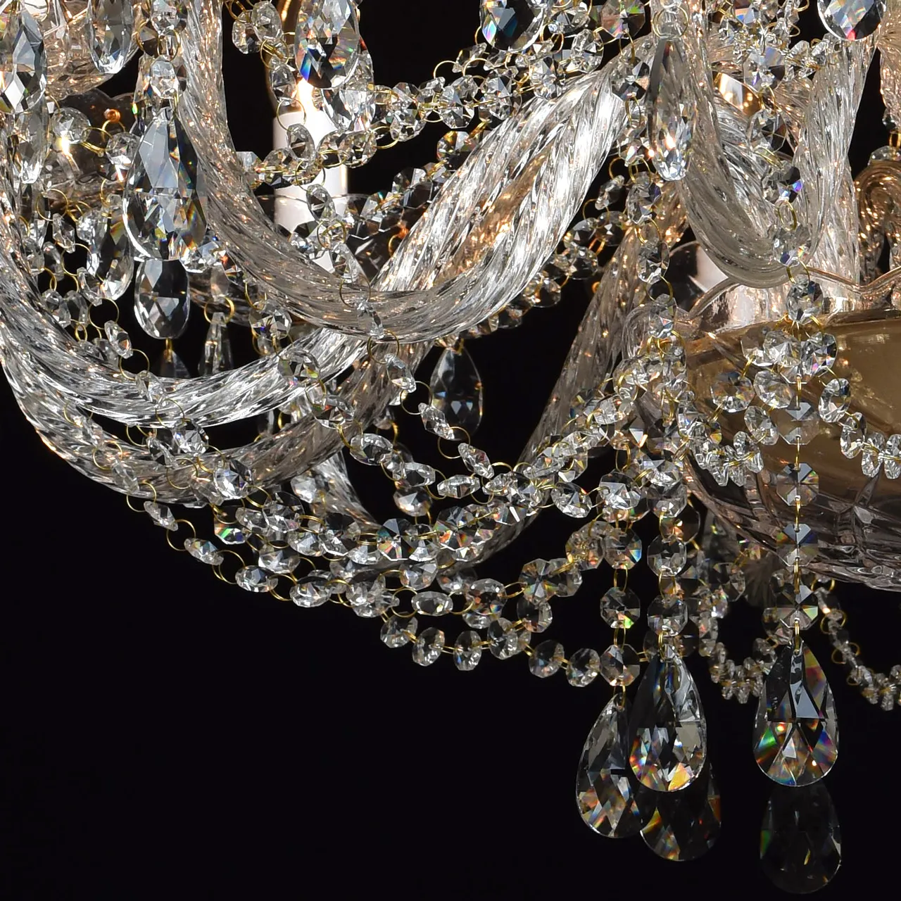 Металлическое основание цвета золота, декоративные элементы из прозрачного хрусталя и стекла с резн