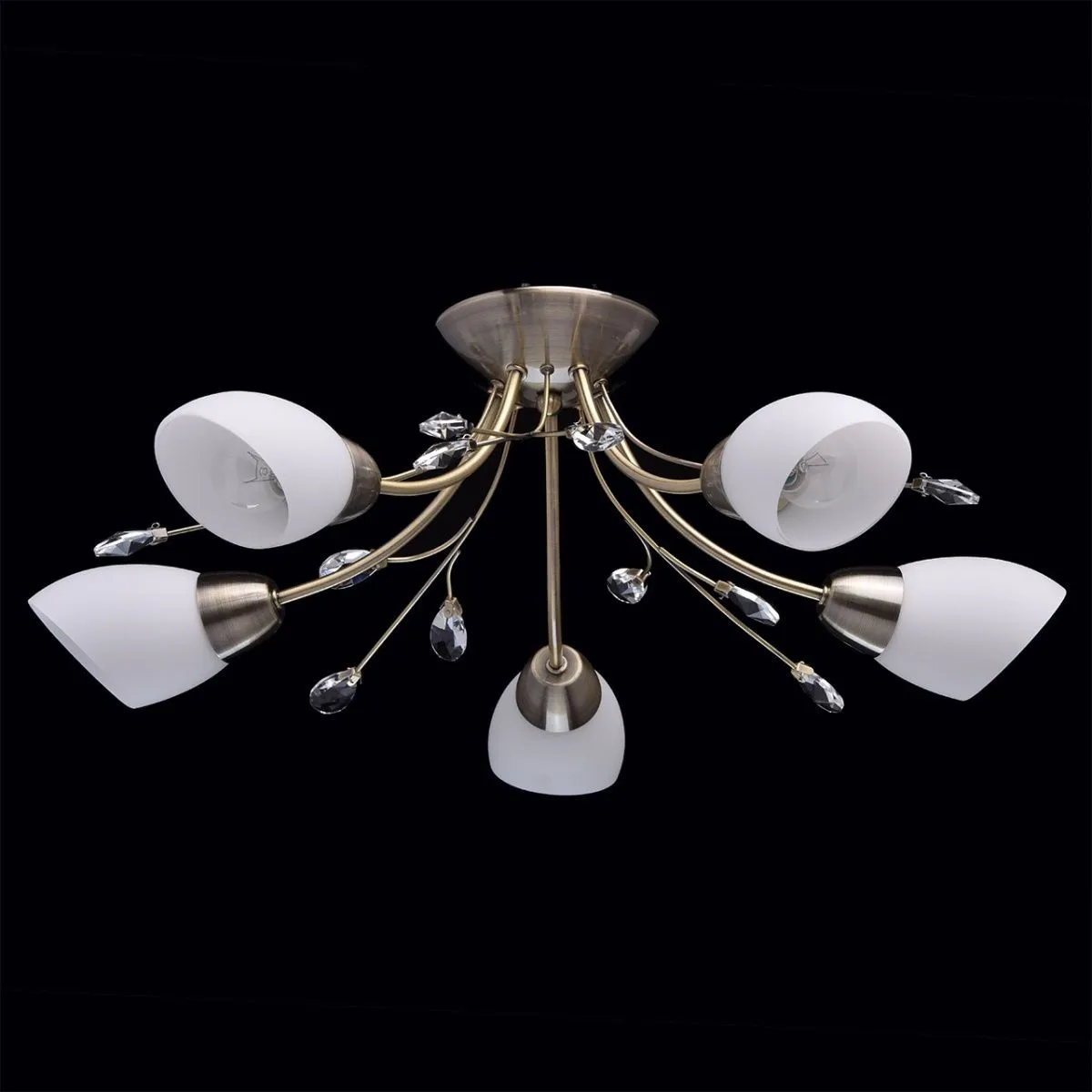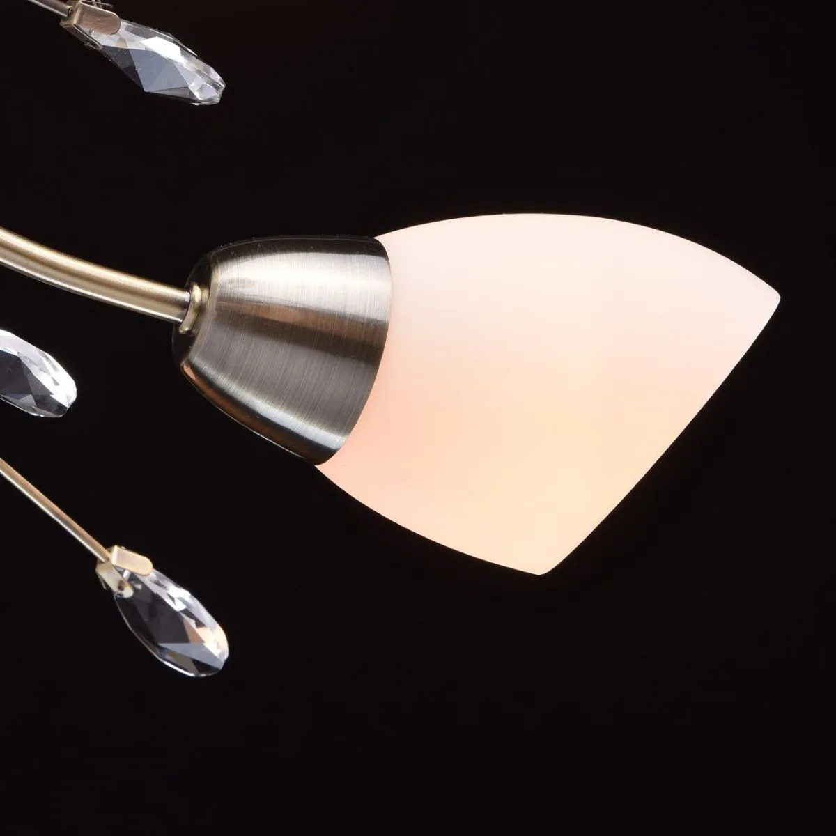 Металлическое основание цвета античной бронзы, стеклянные матовые плафоны, хрусталь